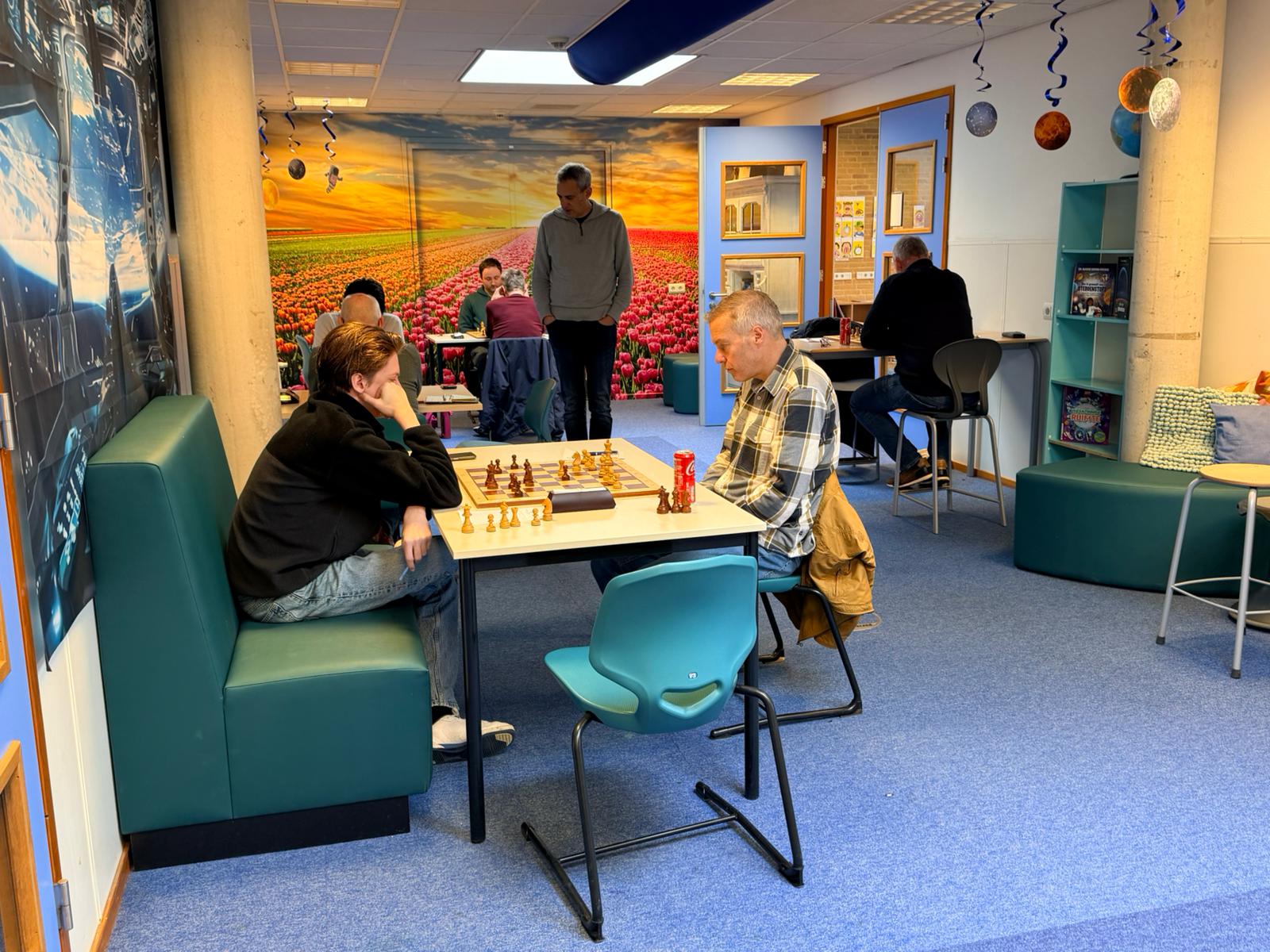 Binnen no time was al duidelijk dat we met 0,5-3,5 achter gingen komen... Ja dat schaakt minder lekker! Het eerste resultaat was nog wel solide te noemen. Sven scoorde een vlot halfje met zwart tegen Jorik Klein (1970). In zijn gekende opening kende hij nooit enige problemen maar met zwart op winst spelen is ook zo wat en dus werd er snel remise gespeeld. Mijn excuses voor het ontbreken van enige flair. Na de umas van vorige keer dacht YT er aan om alle spelers een 'planeet' toe te kennen (zoals de welbekende planeet JupiLter) immers daar zijn ze nu duidelijk mee bezig als we de versierde gangen zien. Enfin beiden liepen niet tegen de lamp of tegen Jupiter op en dus remise.
