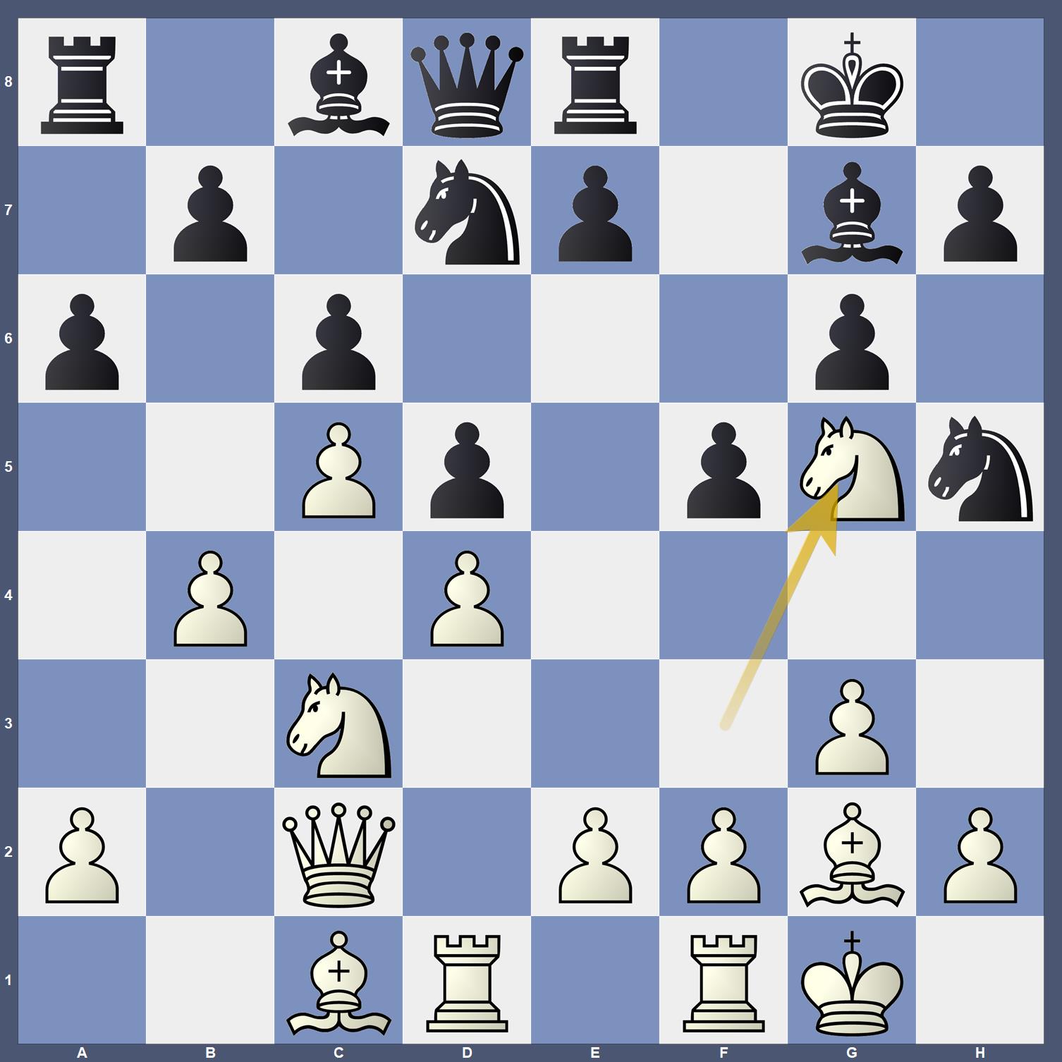 Gelukkig zette uw verslaggever Goes snel weer op gelijke hoogte. Tegenstander Lendert van den Ouden (nog wel bekend van de snelschaaktoernooien in Zierikzee uit het verleden) ging voor dezelfde theorie als wat hij 10 jaar geleden speelde aldus Chessbase. Begrijpelijkerwijs had ik hier niet superveel aandacht aan besteed met een rits andere mogelijke tegenstanders en 10 jaar is best een lange tijd natuurlijk... Gelukkig kwam wat ik bekeken had wel allemaal op het bord. Zo een typische Chebanenko waarbij het erom gaat of / wanneer zwart e5 kan doen. Na de theorie kreeg zwart er Ph5-f5 doorheen. De engine is geen fan overigens ik vond het wel lastig... Enfin wit moest er voor gaan met Pg5-f4 om e5 te stoppen. Zwart deed dan toch maar e5?? maar dat faalde tactisch omdat ik op d5 winnend een stuk kon offeren. Enfin ik zal een diagrammetje toevoegen dat is weer makkelijker voor de lezer!
