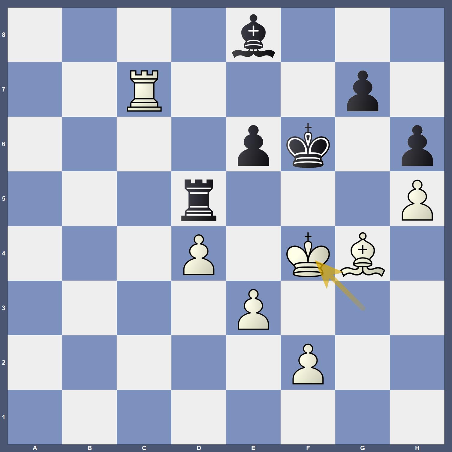 Hier vergreep zwart zich dus aan de pion met 41... Lxh5? Na 42. e4 moest hij wel 42... g5+ 43. Kg3 Txd4 44. Lxh5 Txe4 doen met een totaal verloren stelling. Er was gehoopt op 42... Tg5 maar dan komt 43. e5+ Kg6 en 44. Lxe6 met een gemakkelijk gewonnen positie. In de partij ging de h-pion er ook snel af en kon wit uiteindelijk afwikkelen naar een gewonnen pionneneindspel waarin YT nog even mocht laten zien dat hij ‘sleutelvelden’ beheerst! Na iets als 41... La4 moet het ook een keer winnen bijvoorbeeld door Ta7-Ta6 met aanval op e6. Het plan Tc4 en dan e4-e5 lijkt minder overtuigend...