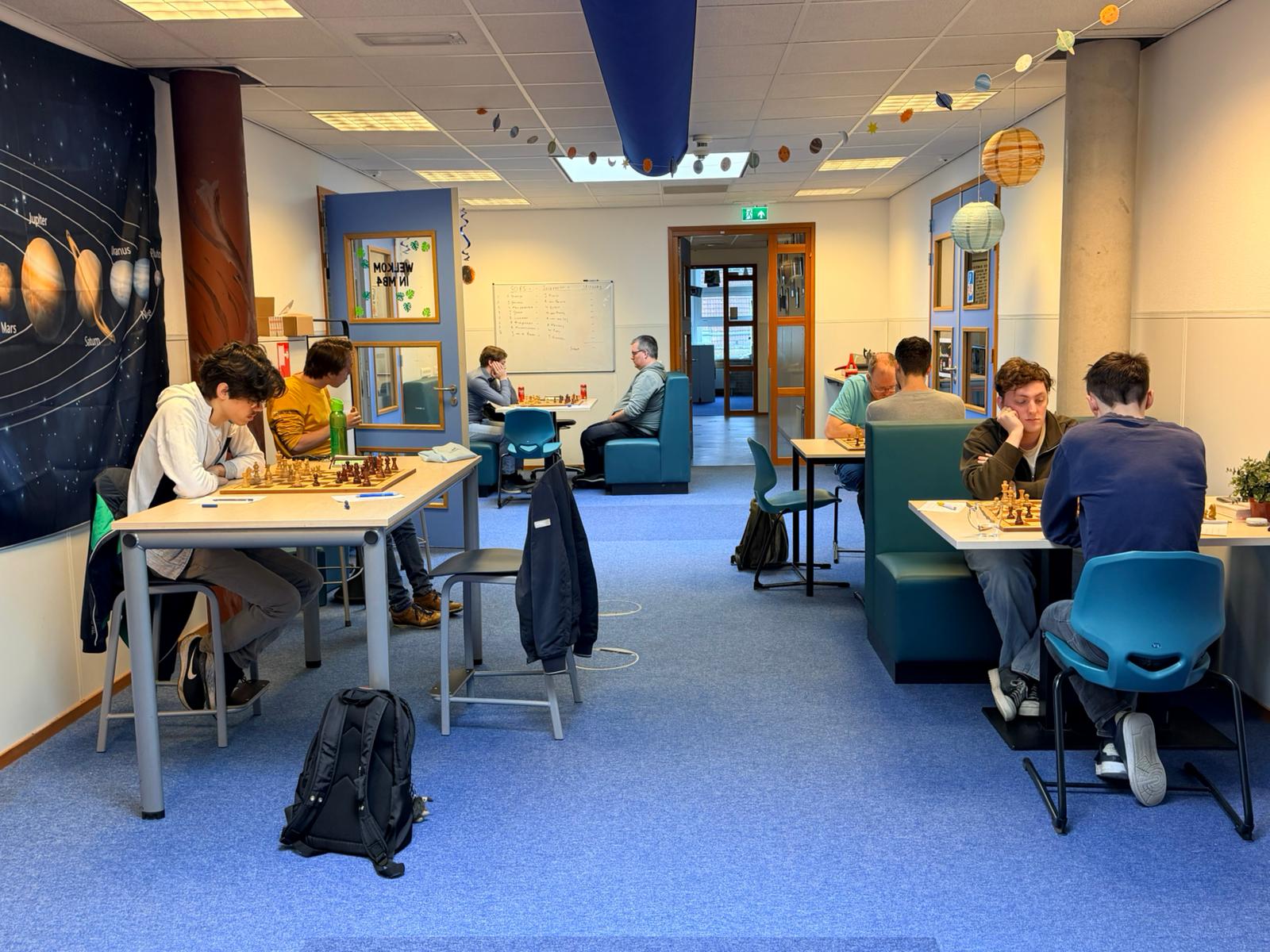 Binnen no time was al duidelijk dat we met 0,5-3,5 achter gingen komen... Ja dat schaakt minder lekker! Het eerste resultaat was nog wel solide te noemen. Sven scoorde een vlot halfje met zwart tegen Jorik Klein (1970). In zijn gekende opening kende hij nooit enige problemen maar met zwart op winst spelen is ook zo wat en dus werd er snel remise gespeeld. Mijn excuses voor het ontbreken van enige flair. Na de umas van vorige keer dacht YT er aan om alle spelers een 'planeet' toe te kennen (zoals de welbekende planeet JupiLter) immers daar zijn ze nu duidelijk mee bezig als we de versierde gangen zien. Enfin beiden liepen niet tegen de lamp of tegen Jupiter op en dus remise.