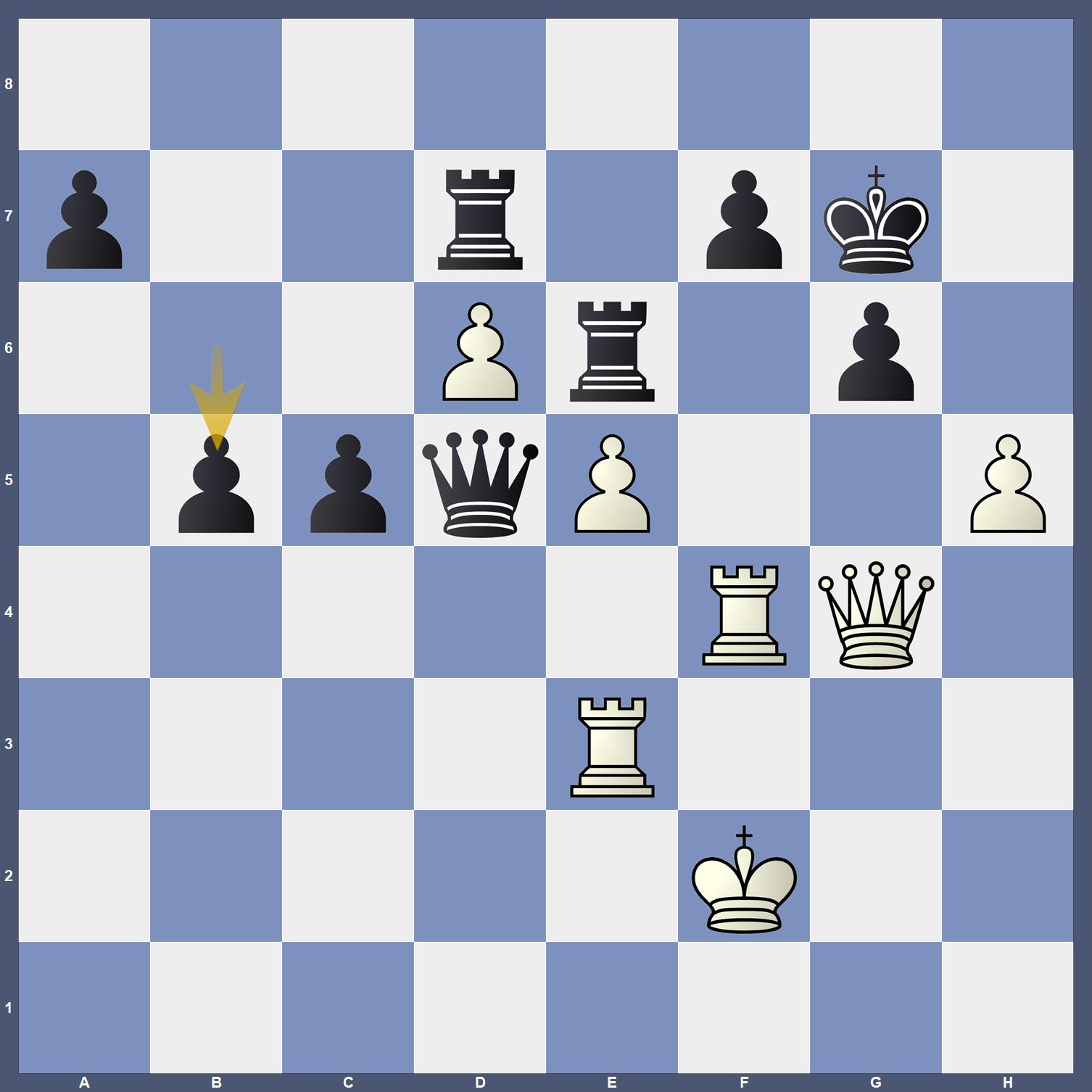 Hier vergreep zwart zich dus aan de pion met 41... Lxh5? Na 42. e4 moest hij wel 42... g5+ 43. Kg3 Txd4 44. Lxh5 Txe4 doen met een totaal verloren stelling. Er was gehoopt op 42... Tg5 maar dan komt 43. e5+ Kg6 en 44. Lxe6 met een gemakkelijk gewonnen positie. In de partij ging de h-pion er ook snel af en kon wit uiteindelijk afwikkelen naar een gewonnen pionneneindspel waarin YT nog even mocht laten zien dat hij ‘sleutelvelden’ beheerst! Na iets als 41... La4 moet het ook een keer winnen bijvoorbeeld door Ta7-Ta6 met aanval op e6. Het plan Tc4 en dan e4-e5 lijkt minder overtuigend...